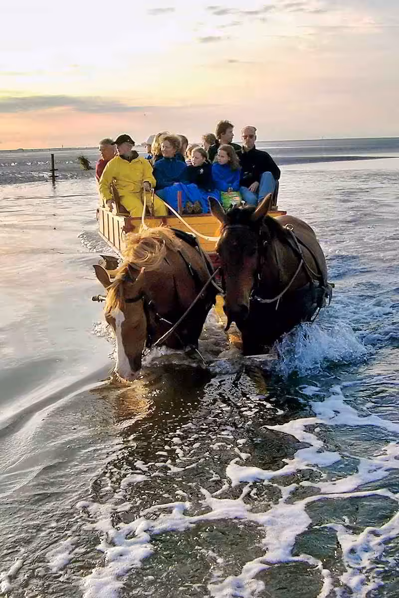 High-wheeled and well-suspended, the two-in-hands pull their passengers safely through the mudflats and tidal flats. In just over an hour you can directly reach the hotel Nige Hus. Unforgettable will be the smell of sea and mudflats, enjoy pure nature. The ride on the wadden car is a very special experience and the wonderful beginning of your island vacation!