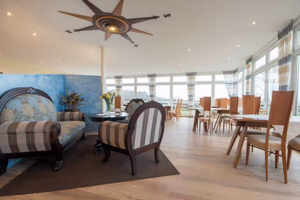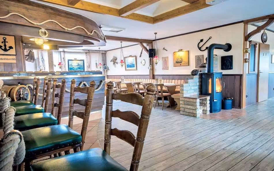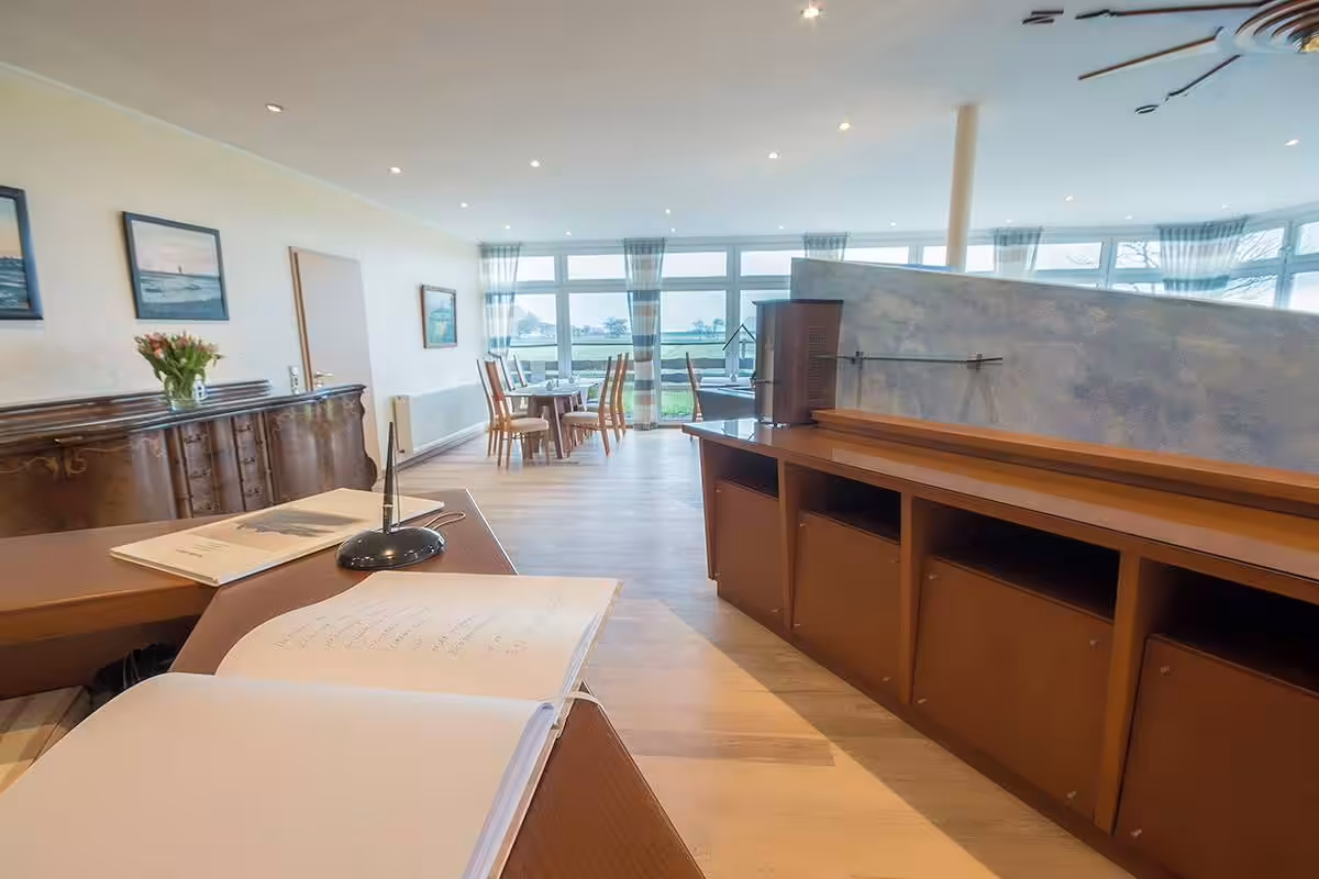 Our bright and light-flooded winter garden serves as a breakfast room for hotel and day guests and connects the hotel with the restaurant. Antique and modern furniture give the room a special charm and guests can enjoy their coffee with a view of horse meadows and the old lighthouse. Early risers who have already completed a wonderful mudflat hike from the mainland to Neuwerk like to stop in for a hearty breakfast. In the small library, guests can cozy up with a book in antique armchairs.
