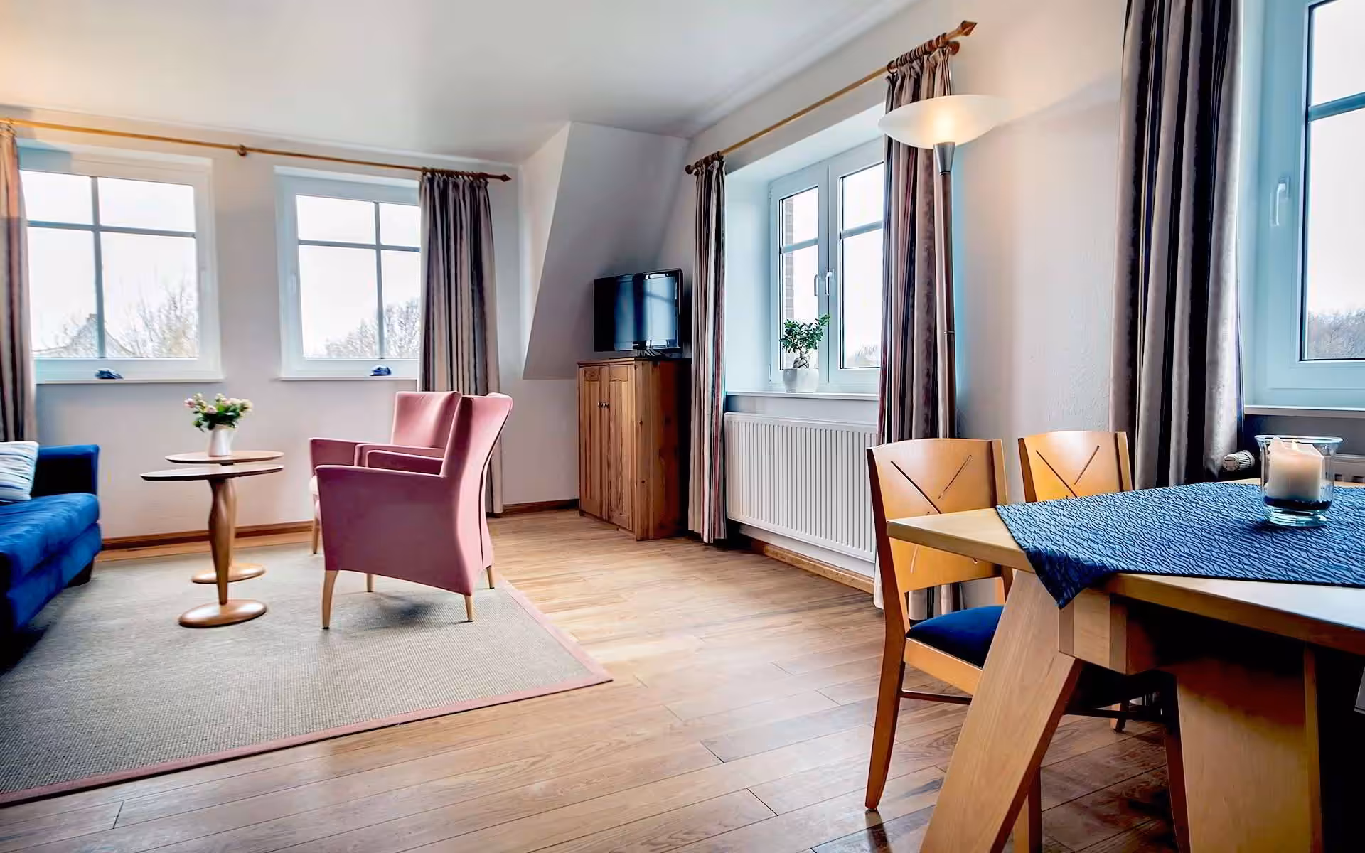 From the living room of this suite (maximum occupancy: 3 adults or 2 adults and 2 children) you have a beautiful view over Neuwerk towards the Elbe fairway. Both the living room and the bedroom have flat screen TVs. This suite gets its individual charm from the comfortable size and the noble wooden floor. The equipment also includes a safe, radio and of course the bathroom with shower / WC.