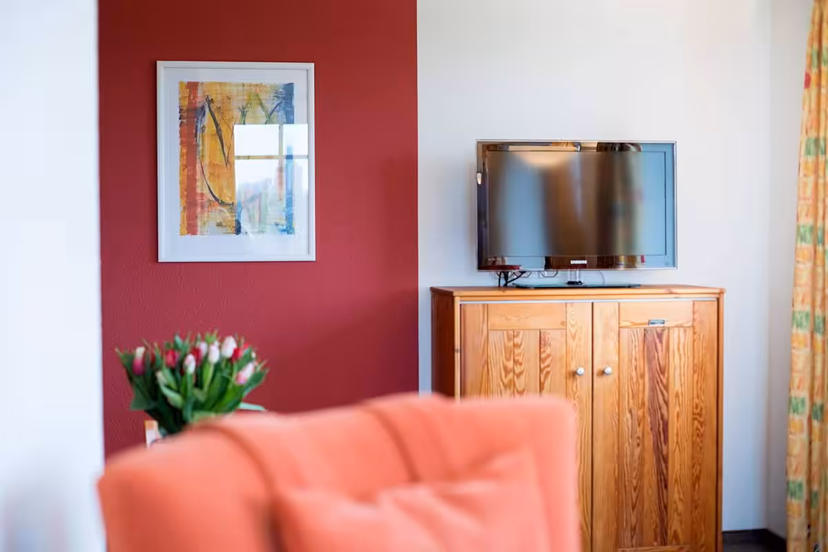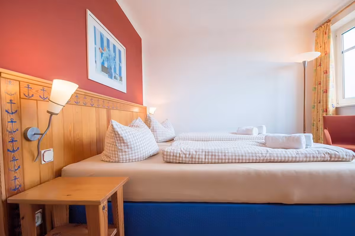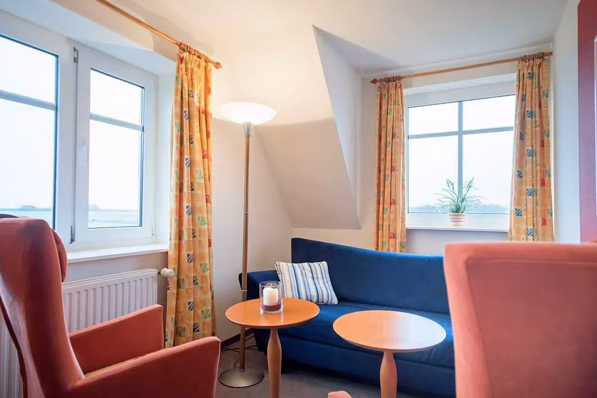 In the Suite South-East (maximum occupancy: 3 adults or 2 adults and 2 children) you will enjoy a beautiful view of Neuwerk and the old lighthouse. In the separate living room with sofa bed you can watch the shipping traffic on the Elbe fairway. The interior is decorated in friendly, bright colors. Amenities include a bathroom with shower/WC, a flat-screen TV, a radio, a telephone and a safe.
