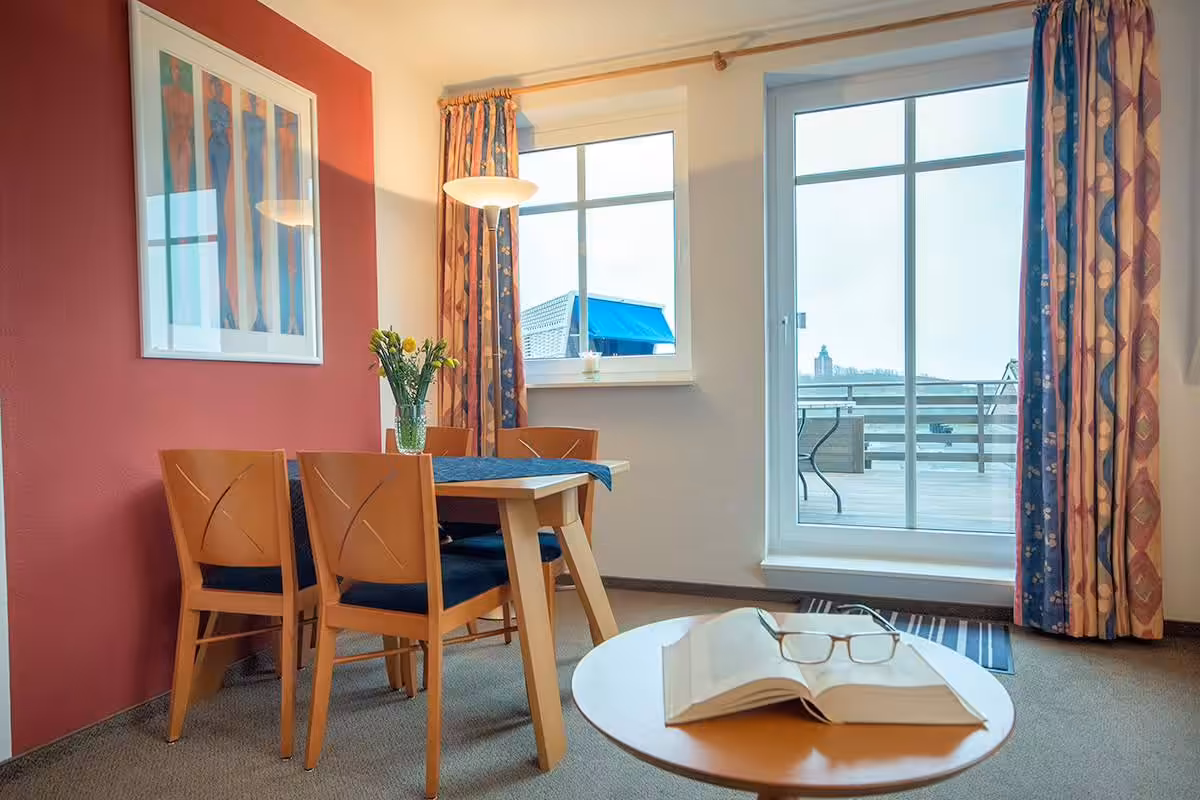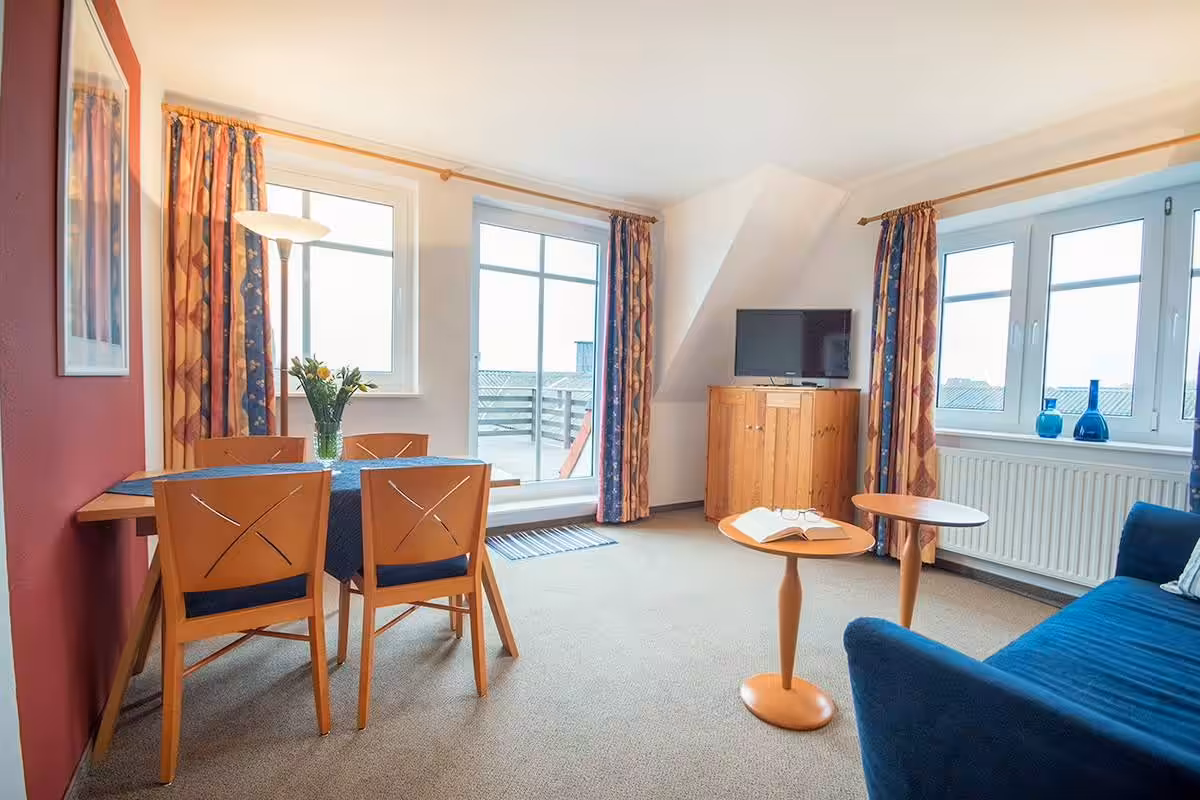 The suite on the 1st floor impresses with its large roof terrace with a beach chair, loungers and seating, which provides a beautiful view in the direction of the mainland and Neuwerk. The roof terrace is accessible via a door from the living room. Suite South-West, like all suites, has separate living room and bedroom, so the sofa bed is an ideal addition for additional fellow travelers (maximum occupancy: 3 adults). In addition, it is equipped with a daylight bathroom (shower/WC), two flat-screen TVs, radio, telephone, safe and free WLAN.