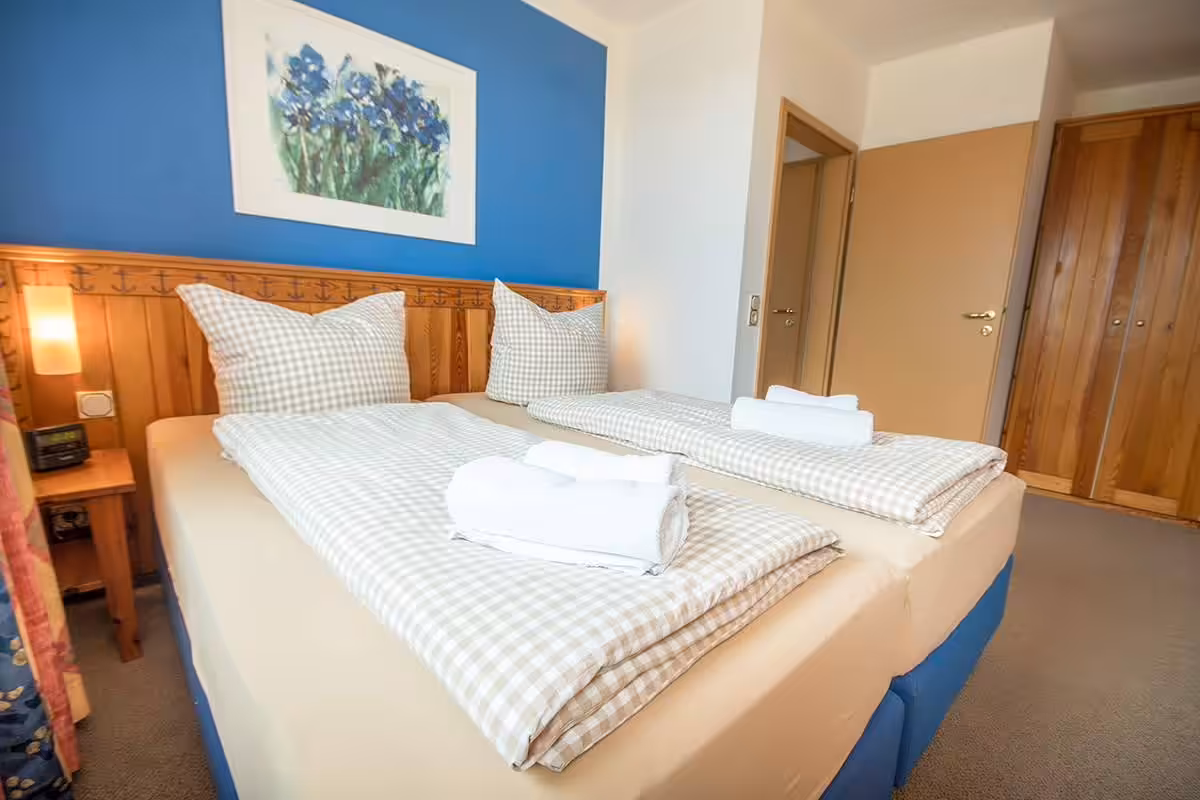 - Bedroom with box spring bed (2 x 90×200 mattresses)